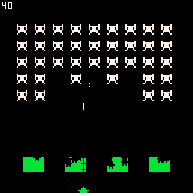 This is a port of the original arcade Space Invaders in just over half a kilobyte. I had to simplify a few things, like only having one invader type, cutting the UFO, and rethinking the lives system a little bit, but most of the major elements are there.
